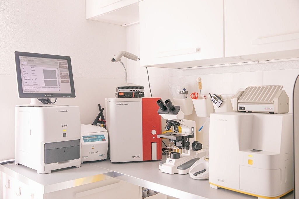 Notre laboratoire interne peut effectuer des bilans sanguins et urinaires ainsi que diverses analyses microscopiques. Nous disposons d’une pièce dédiée aux animaux hospitalisés, lumineuse et équipée pour les soins avec des espaces réservés pour les chats et chiens de toutes tailles.