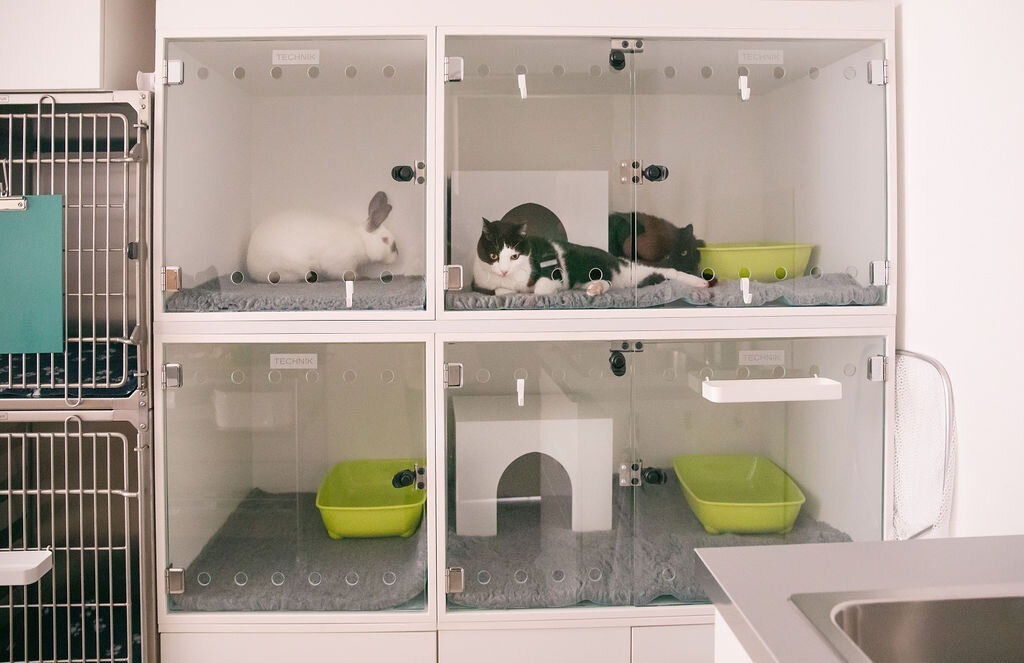 Afin que vos félins aient un environnement sécurisé, confortable et rassurant pendant leur hospitalisation, nous disposons de boxes de grande taille, dont les portes vitrées permettent une surveillance optimale de nos patients.